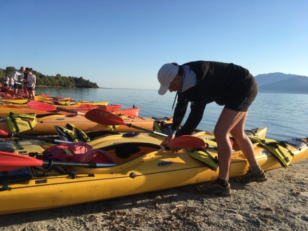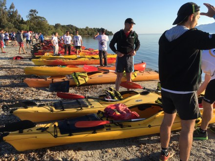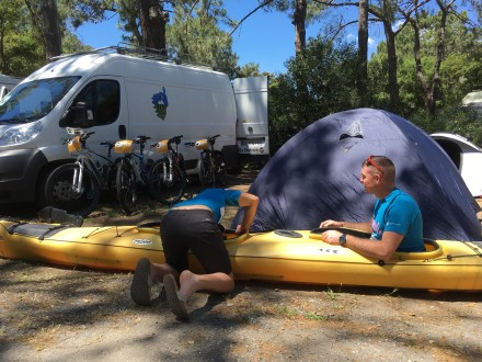 Il n’y a « plus qu’à » installer toutes les tentes et préparer le matériel du Raid. Nous récupérons les kayacks de mer… Non non, on ne s’amuse pas ! C’est réglage des sièges et auttres lanières de sécurité 😉 Tout le monde s’occupe d’un bout de quelque chose. Rangement, installation, cuisine etc…puis briefing officiel de 14h30 à 16h30!